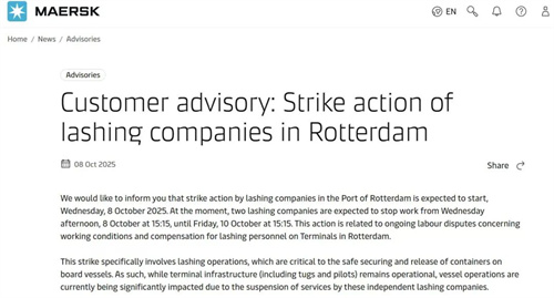 10月8日,全球航運巨頭馬士基在最新客戶通告中稱,鹿特丹港的綁扎公司計劃自當日下午15時15分起正式罷工,預計持續至10月10日同一時間。盡管碼頭基礎設施(包括拖船與引航服務)仍維持運作,但隨著綁扎作業暫停,船舶裝卸和離泊受到嚴重沖擊。