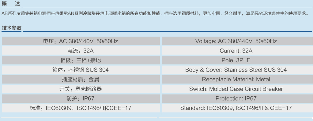 | AB型系列冷藏集裝箱電源插座箱不帶監(jiān)視插座 | |||
