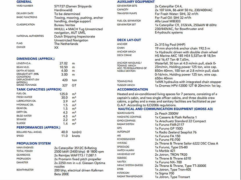 | 發(fā)動(dòng)機(jī)功率: | 2500bkW at 1800rpm | 推進(jìn)裝置: | 2×Promarin fixed pitch propellers |