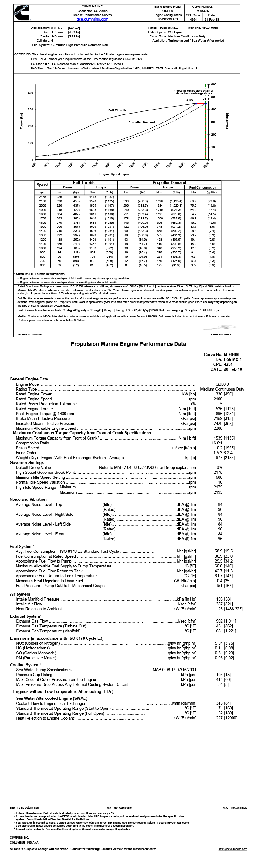 進氣方式: Turbocharged/Sea Water Aftercooled 最大扭矩: 1696N.M(轉速為1400rpm下的最大扭矩)