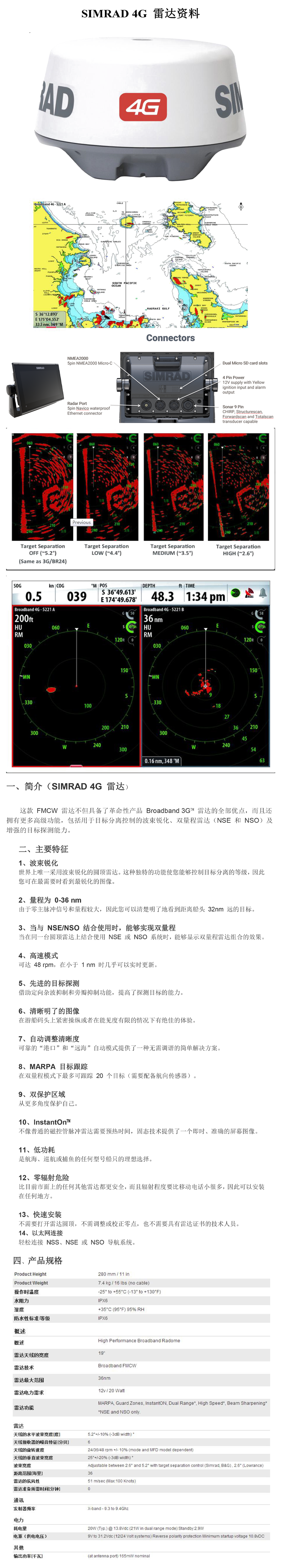 波束寬度: 2.6°~5.2°的(Simrad,B&G);2.6°(Lowrance) 探測范圍: 36nm
