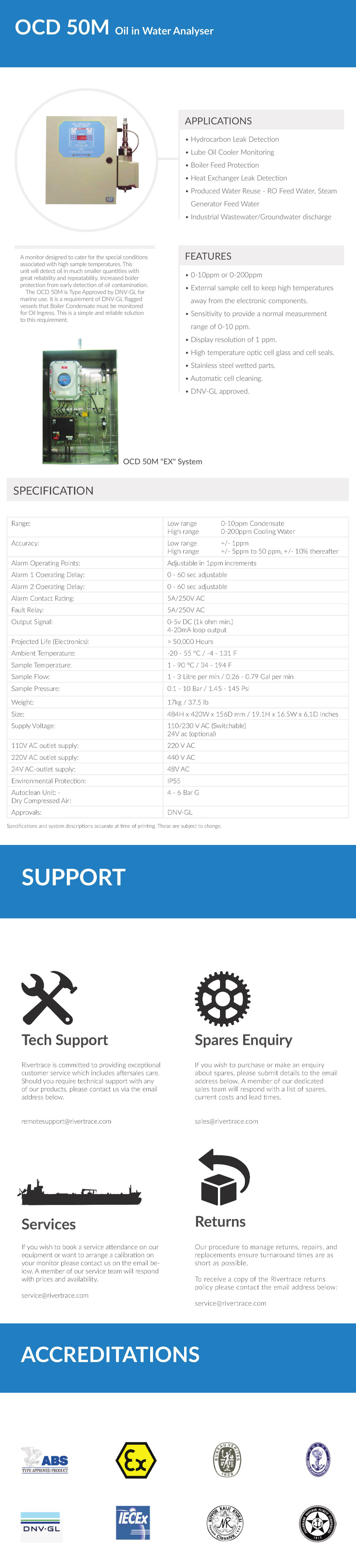 符合標準: DNV-GL 性能亮點: External sample cell to keep high temperatures away from the electronic components; Can detect oil in much smaller quantities with great reliability and repeatability; Have protection from early detection of oil contamination