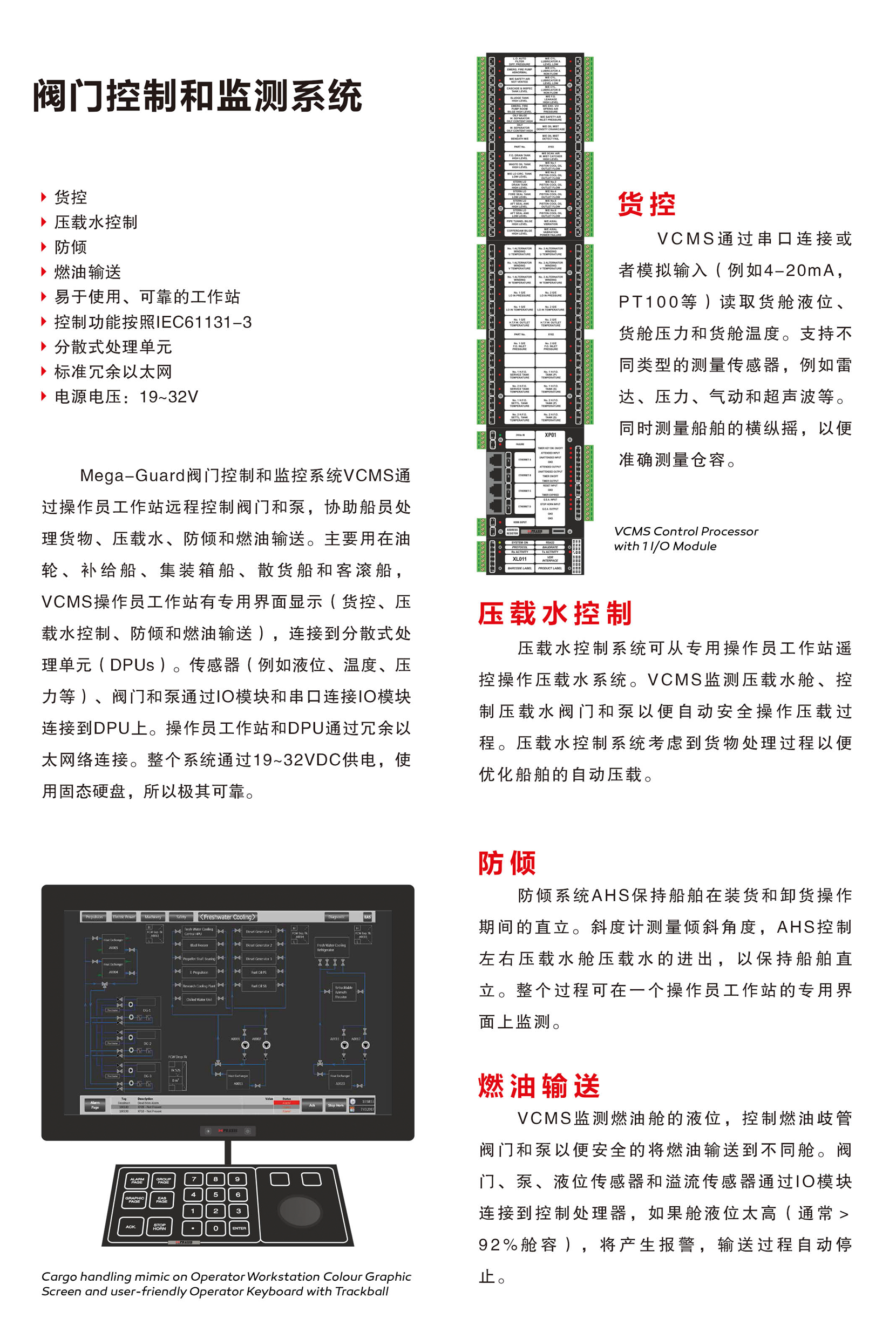 類型: 閥門遙控 系統特點: 整個系統通過19~32VDC供電,使用固態硬盤,極其可靠;優秀的貨控功能,可讀取貨艙液位、貨艙壓力和貨艙溫度;壓載水控制系統考慮到貨物處理過程,可自動優化壓載;防傾系統AHS保持船舶在裝貨和卸貨操作期間的直立;可監測燃油艙的液位,控制燃油管閥門和泵,以便安全地將燃油輸送到不同艙室