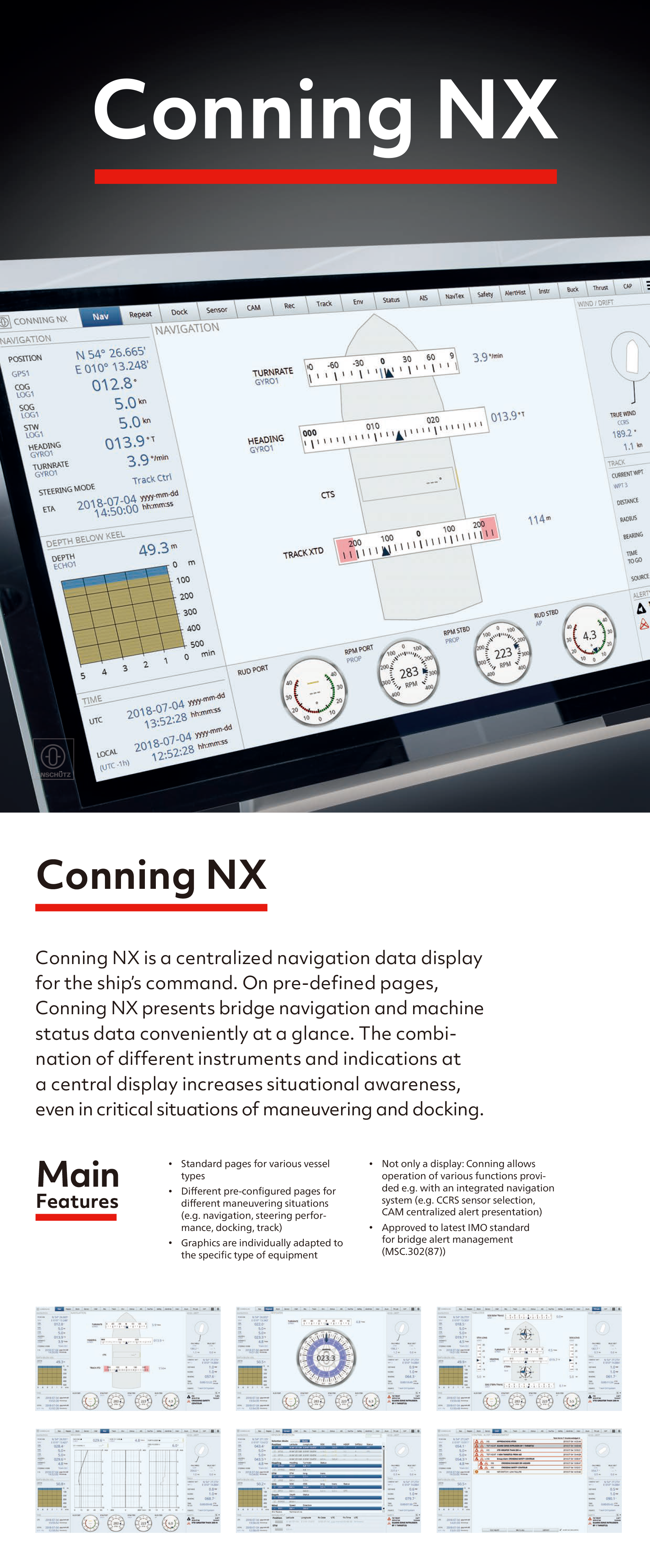| 性能亮點(diǎn): | Standard pages for various vessel types; Different pre-configured pages for different maneuvering situations; Graphics are individually adapted to the specific type of equipment; Not only a display and conning allows operation of various functions provided; Approved to latest IMO standard for bridge alert management | ||